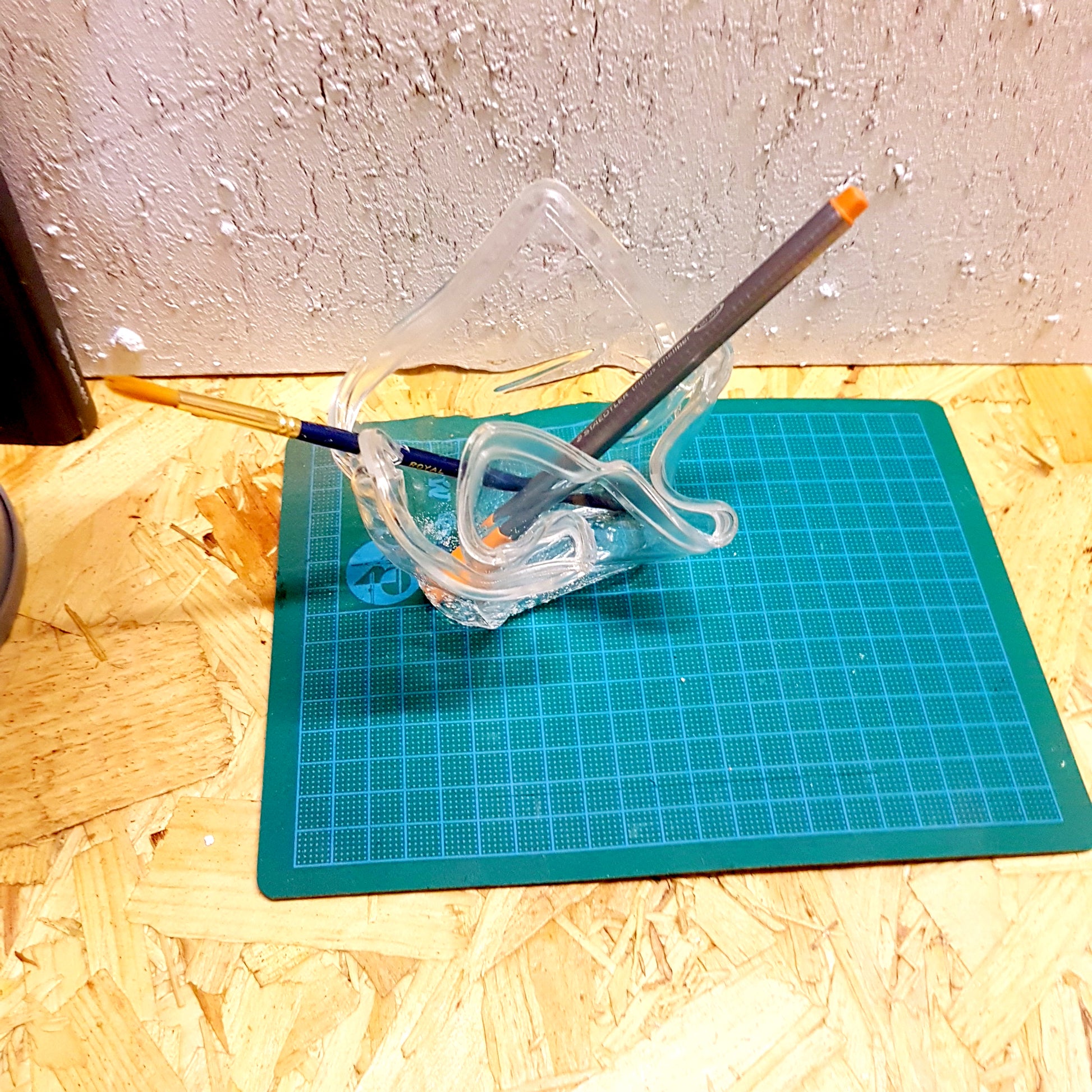 Tidy your desk in style. This transparent desk tidy is a statement on any workstations. It's formed by hand making it unique and one of a kind.