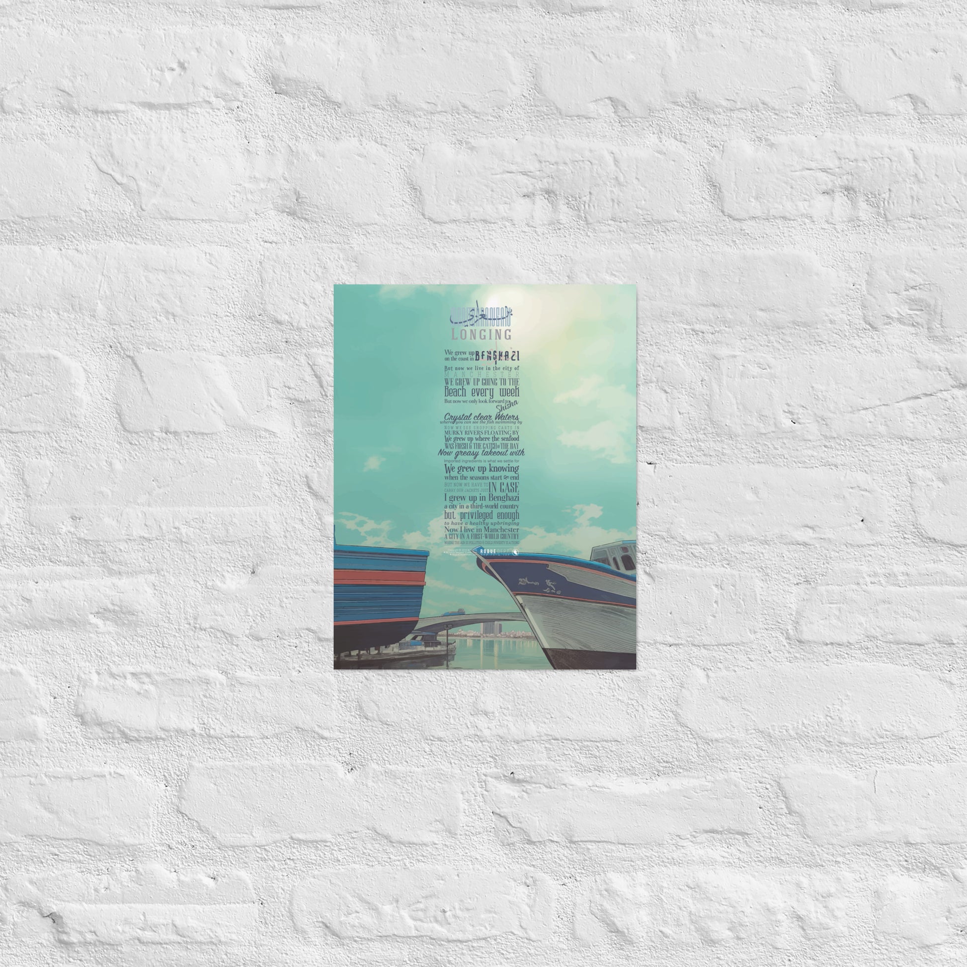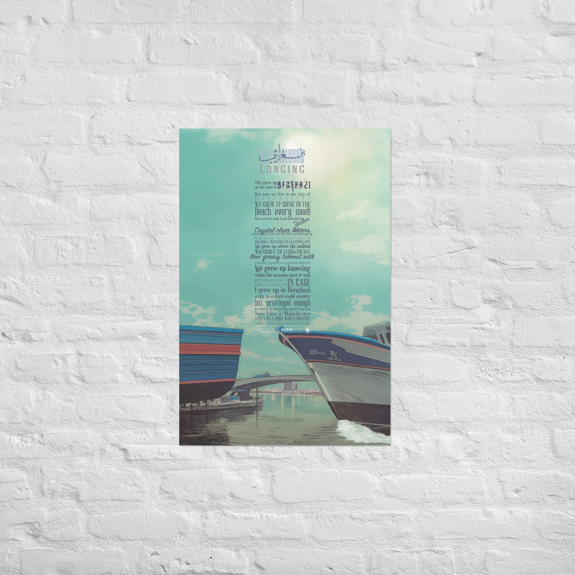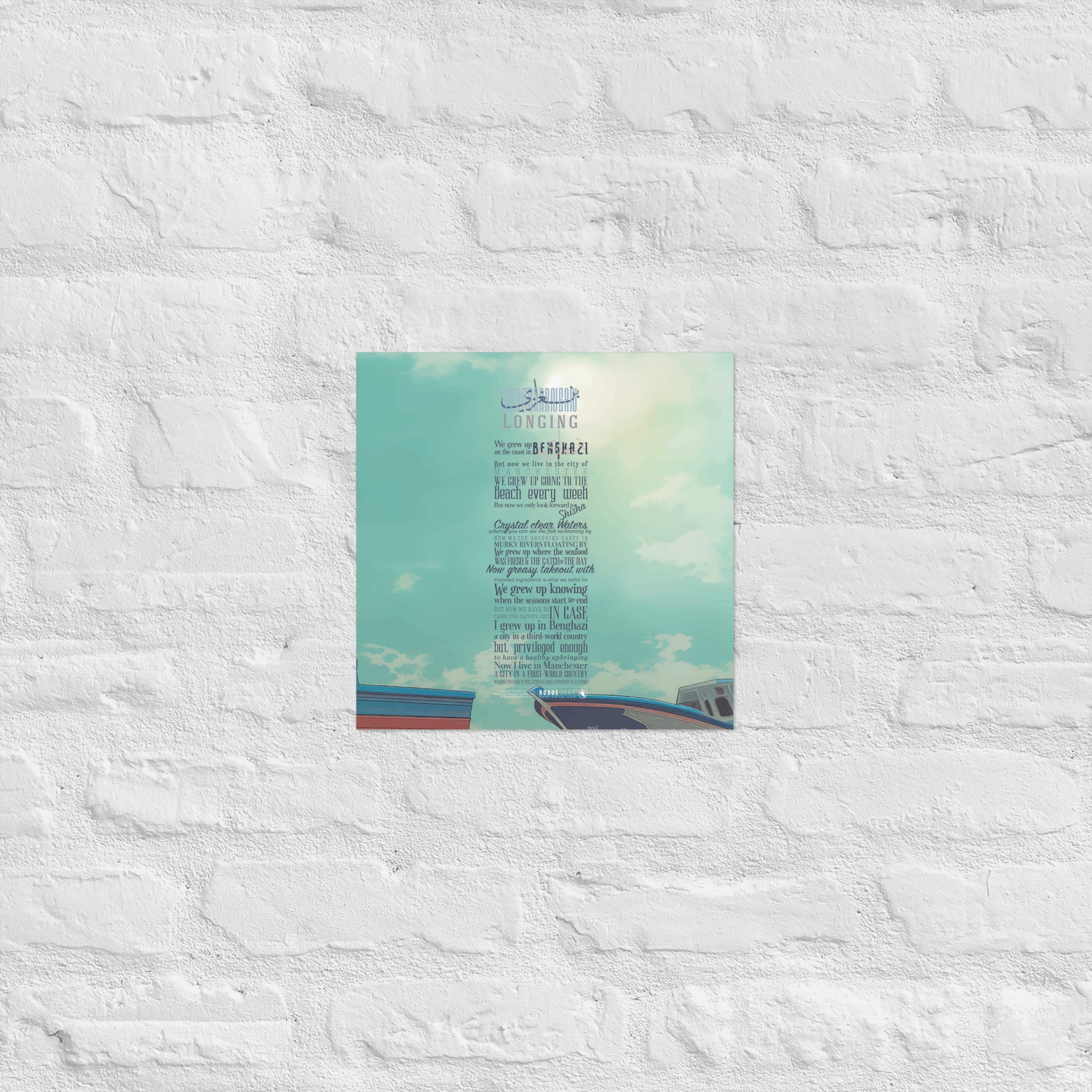 An artwork print of a personal poem in longing of a childhood where the artwork is a photograph by the poet taken from the city of Benghazi