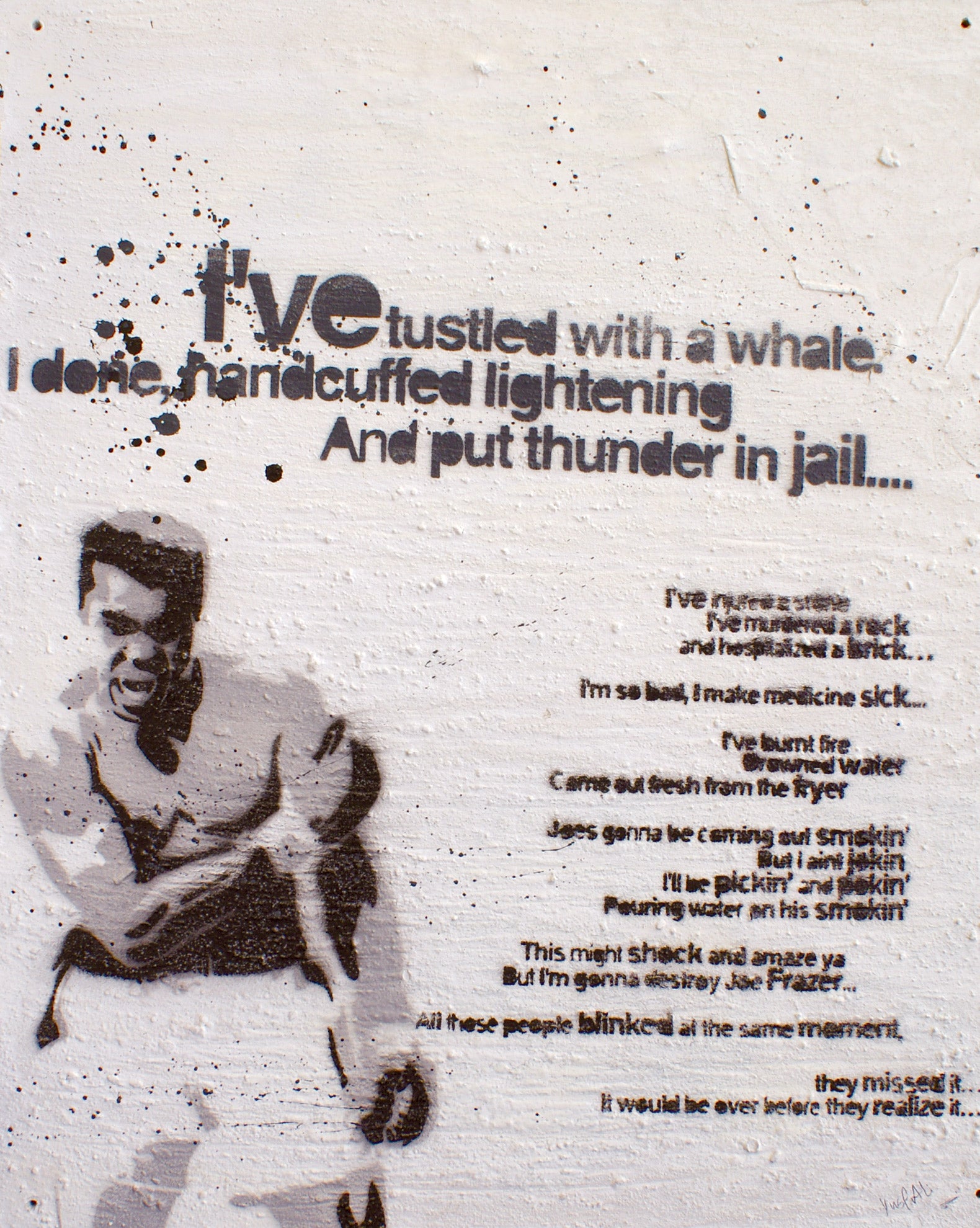 An original painting by artist Yusf Ali with a textured background which includes Muhammad Ali's quotes and lyrics combined with Yusf Ali's, building it up to a few verses:
