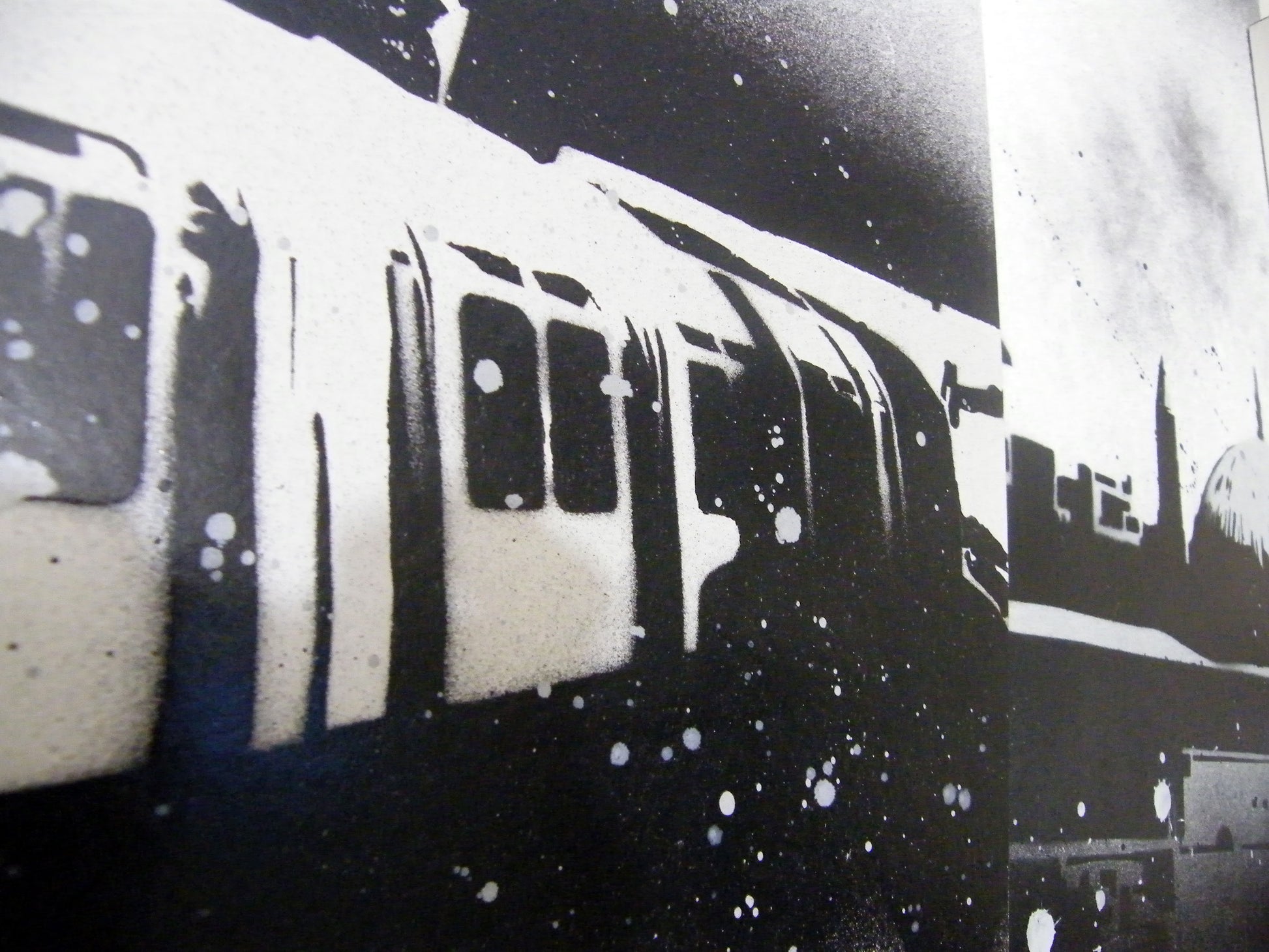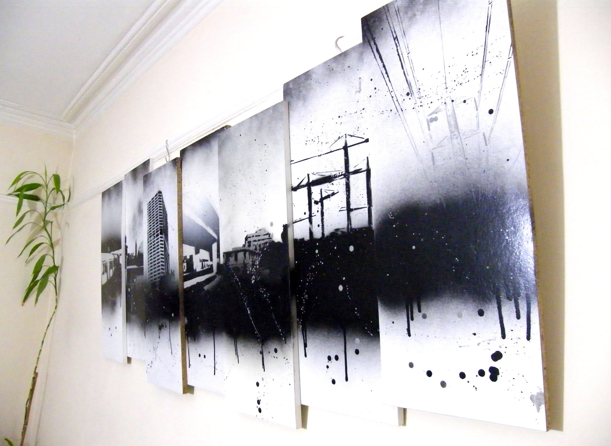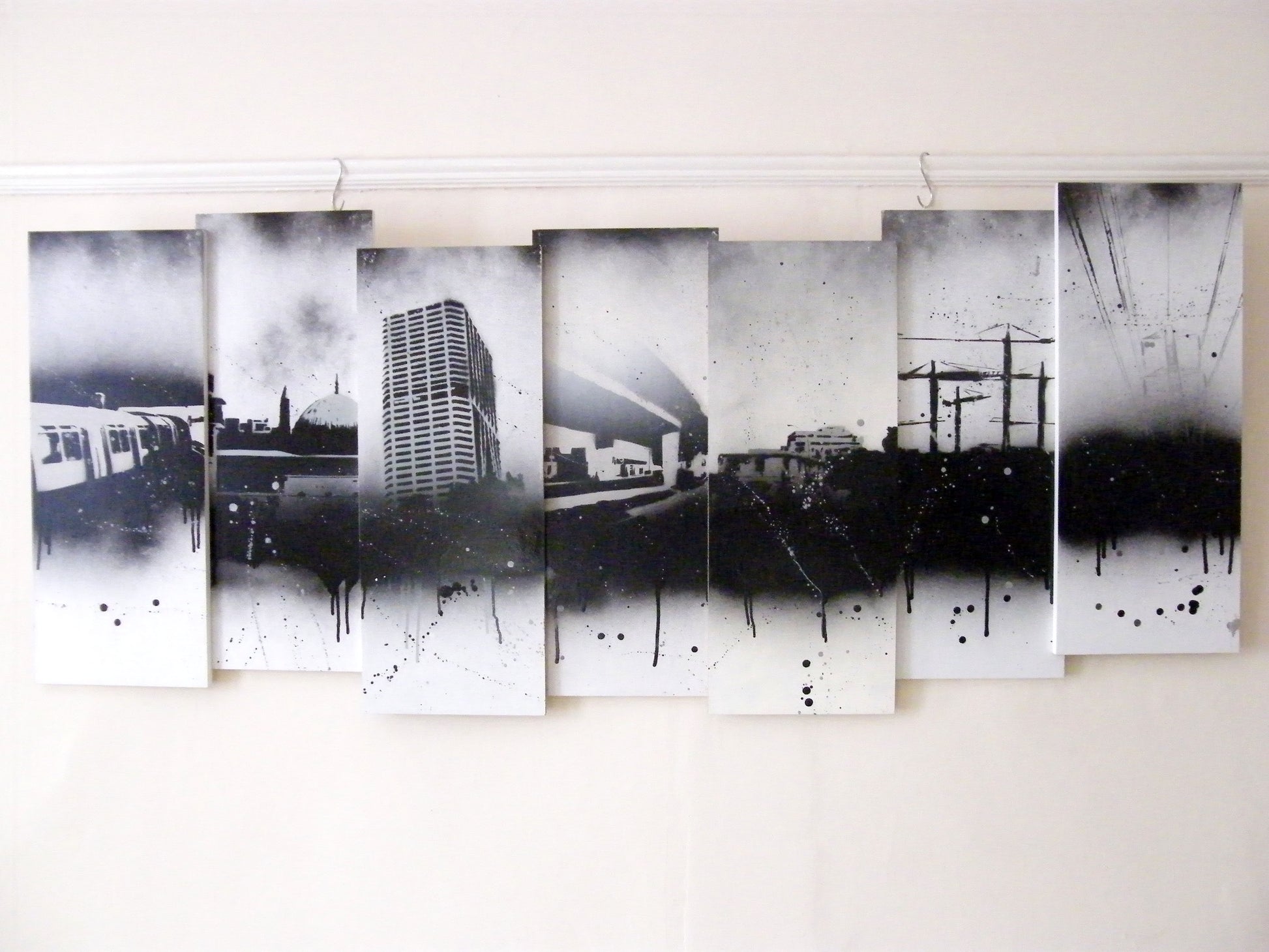 A series of paintings all connected to create a large piece, showing stencilled photographs of Manchester and other parts of the world.